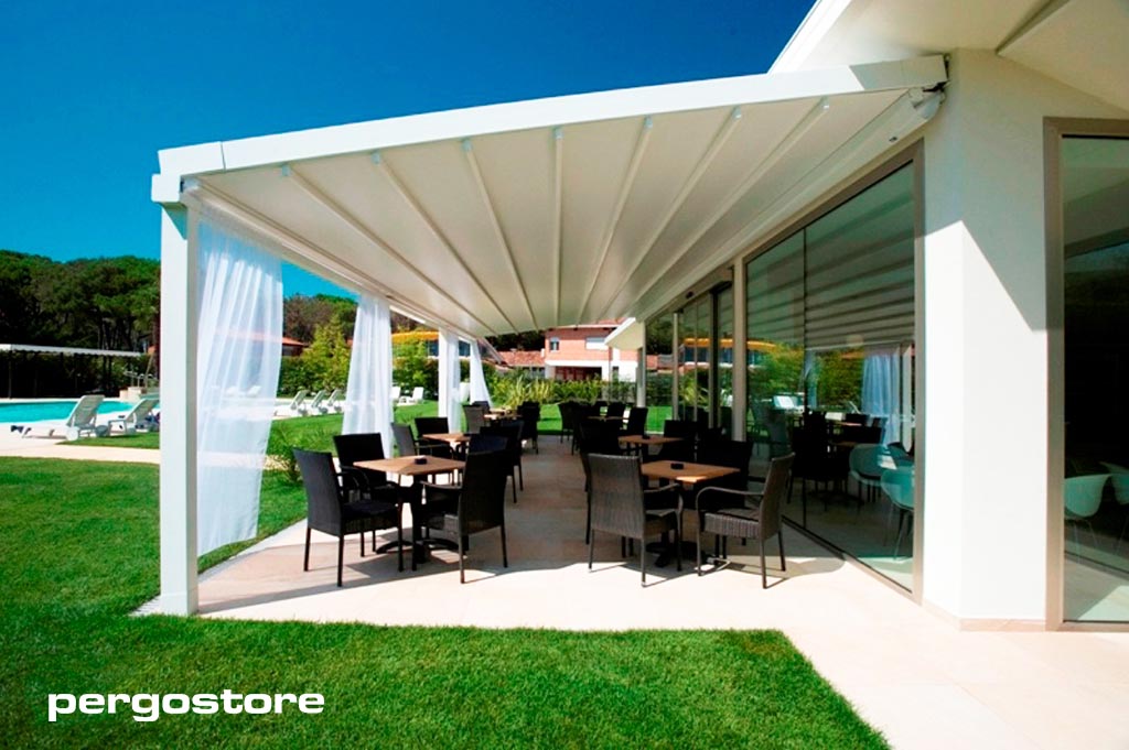PERGOSTORE est une structure de pergola robuste, aluminium et inox, avec toile intégrée et dépliable électriquement à distance. Sur votre terrasse, dans votre jardin, au bord de votre piscine, créez un espace convivial, une ombre fraîche. PERGOSTORE attenue la luminosité sans assombrir, fait obstacle au UV et vous protège d'une ondée passagère. Vous pouvez éclairer et chauffer votre PERGOSTORE pour y passer d'agréables soirées.